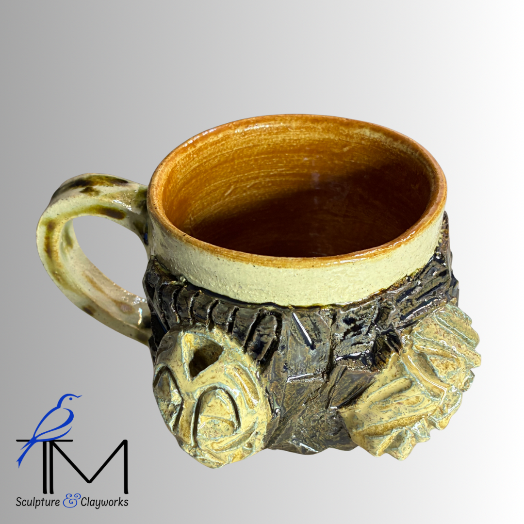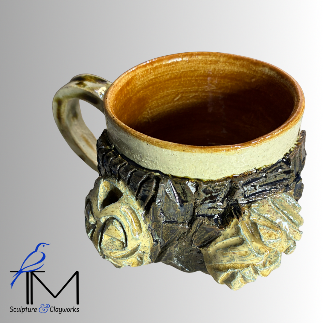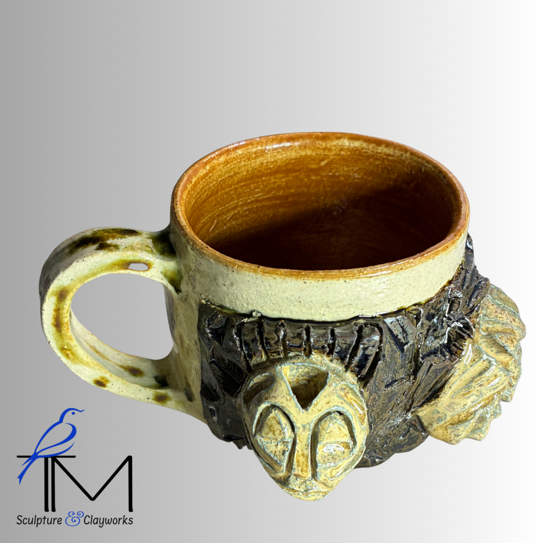 Twice fired stoneware cup featuring two African masks atop Kurinuki platform design. Glazed in Java bean, transparent matte overlay, Stormy blue, Mirror black, Black walnut.