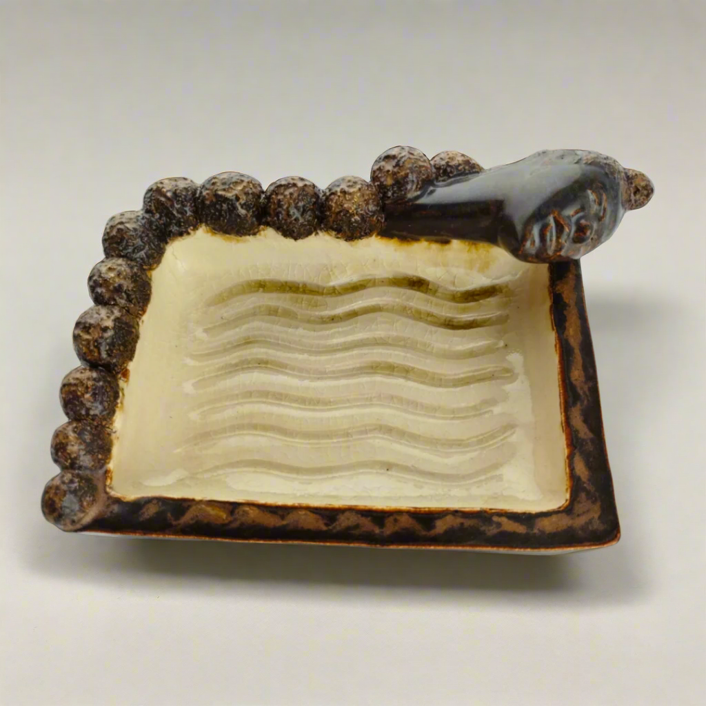 Bisque and glaze fired stoneware ceramic set featuring intriguing accents of two Black women's faces with afro puff ponytailed hair styling. Soap dish and toothbrush/cosmetics holder.