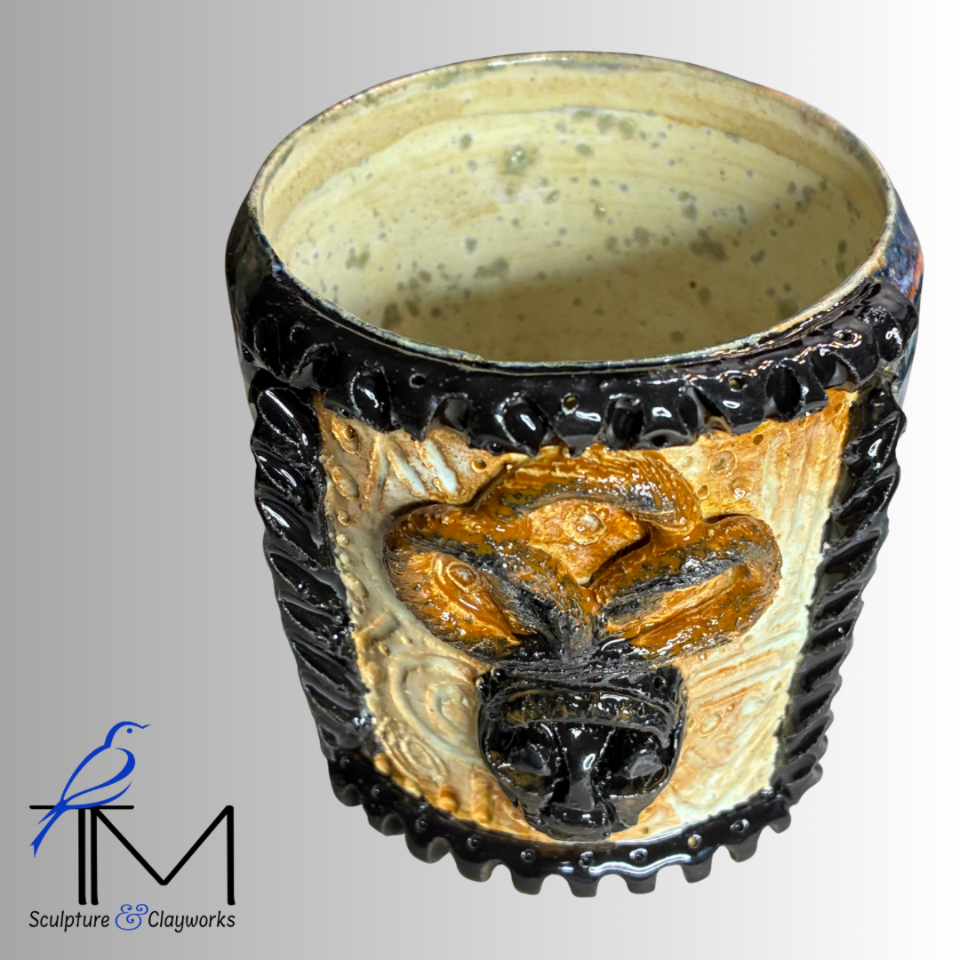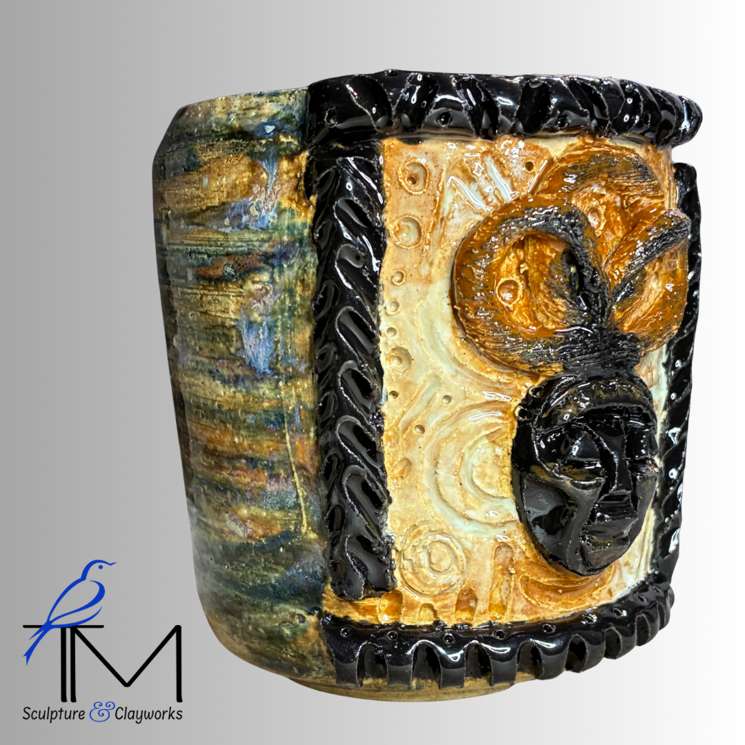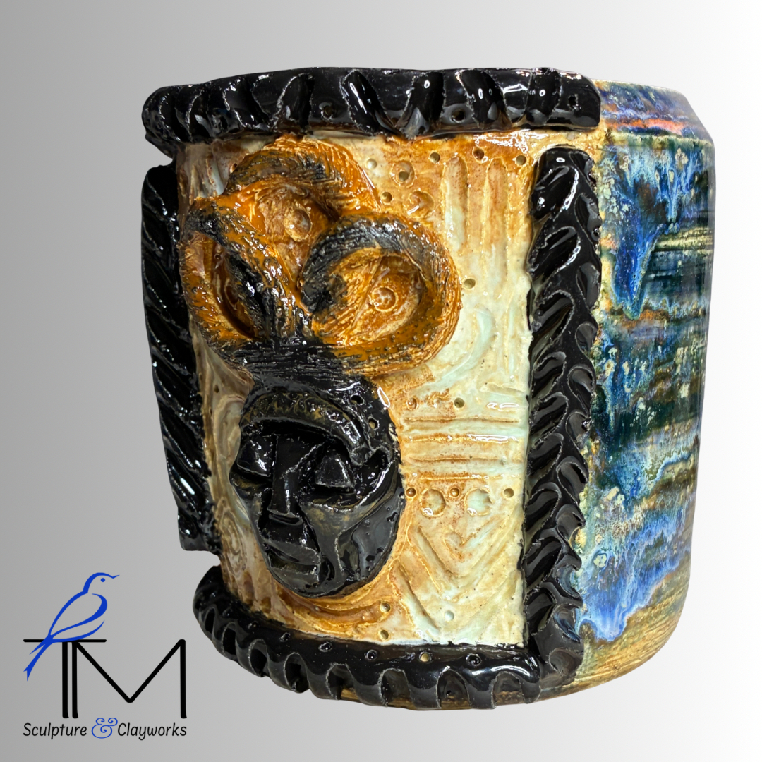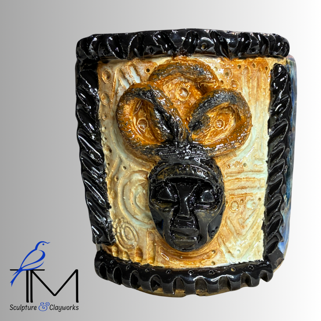 Twice fired stoneware planter featuring sculpture illustration of queen African mask with three styled locks. Planter has three drainage holes and four irrigation channels.