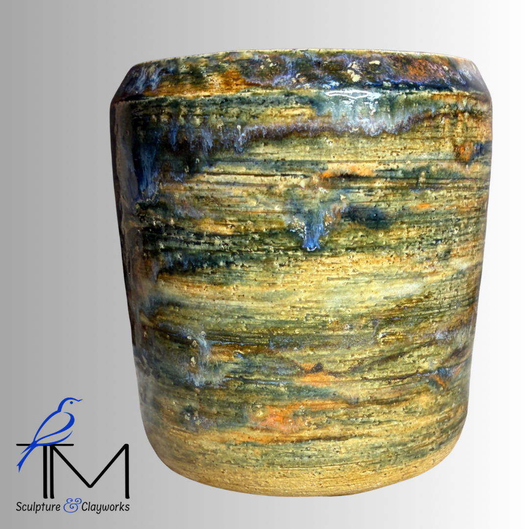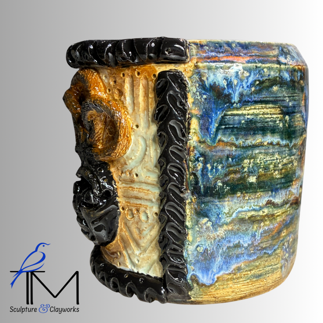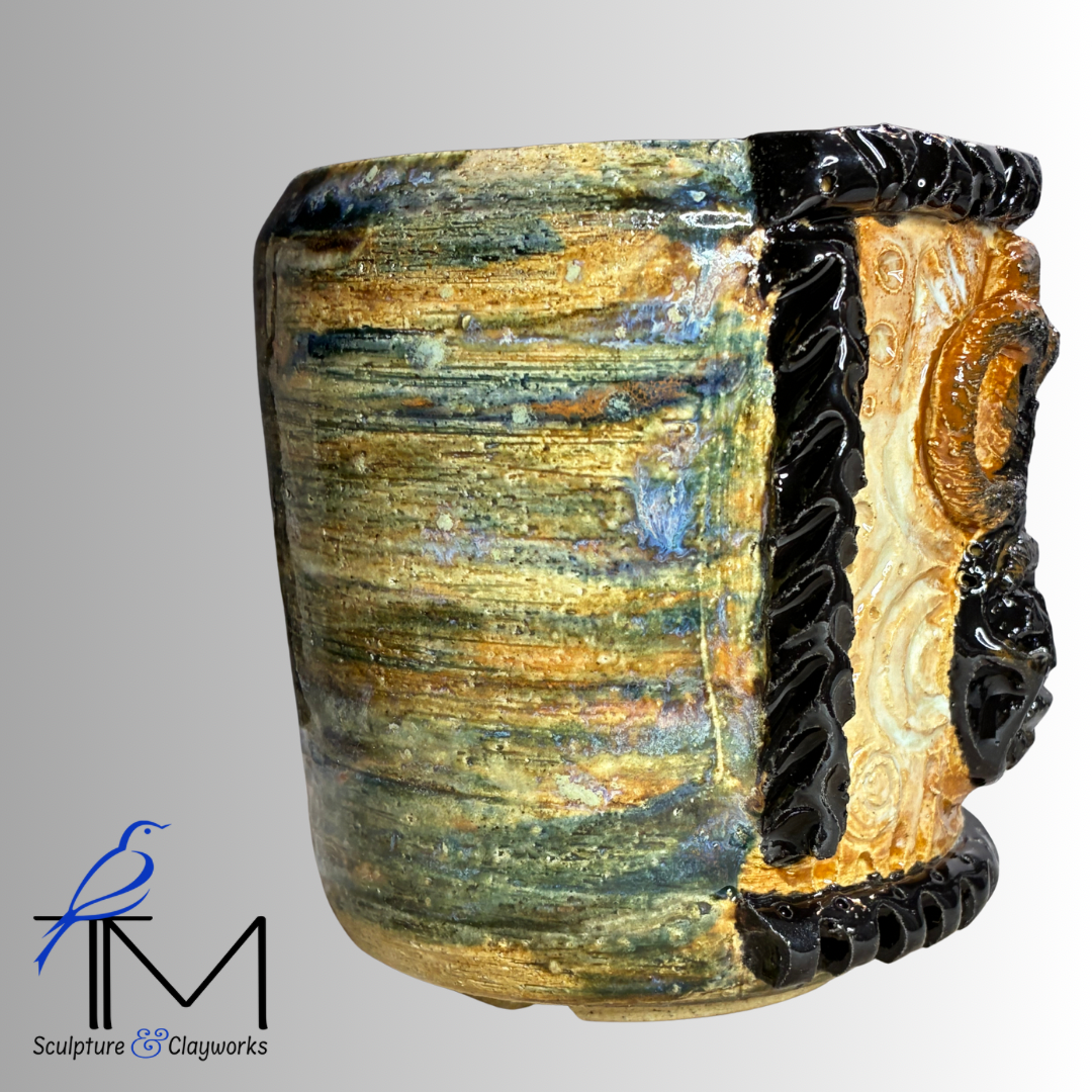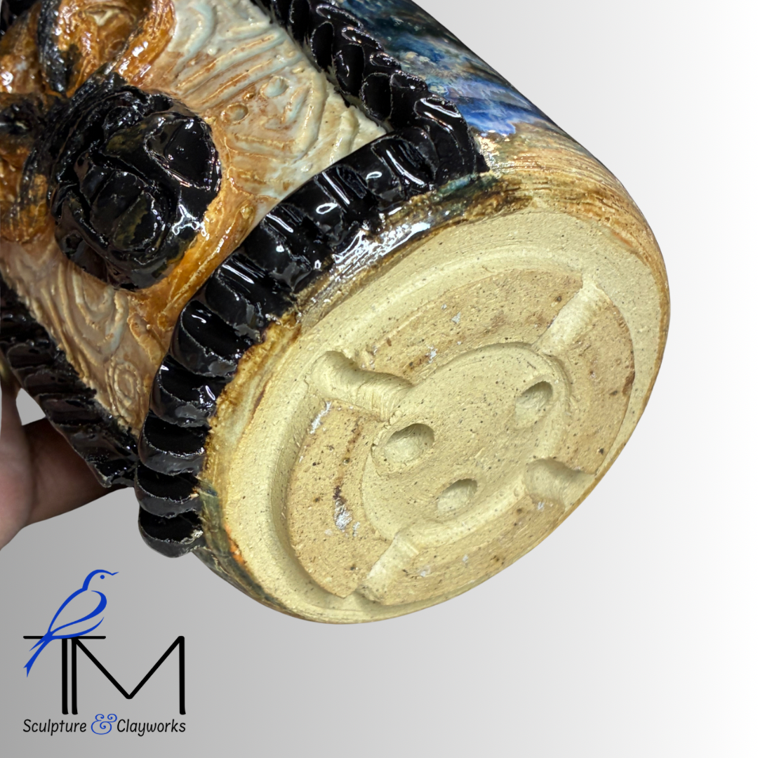 Twice fired stoneware planter featuring sculpture illustration of queen African mask with three styled locks. Planter has three drainage holes and four irrigation channels.