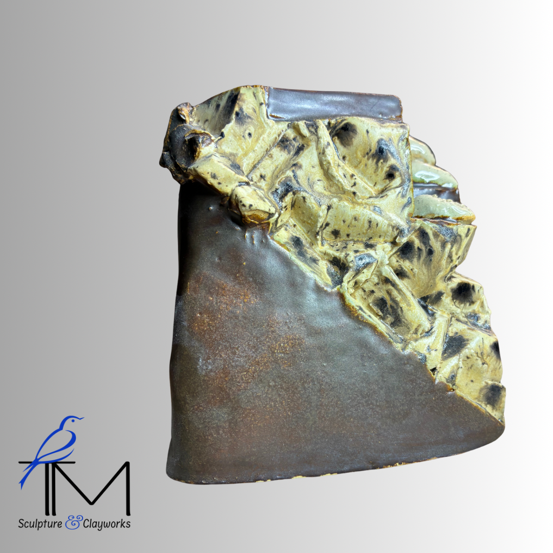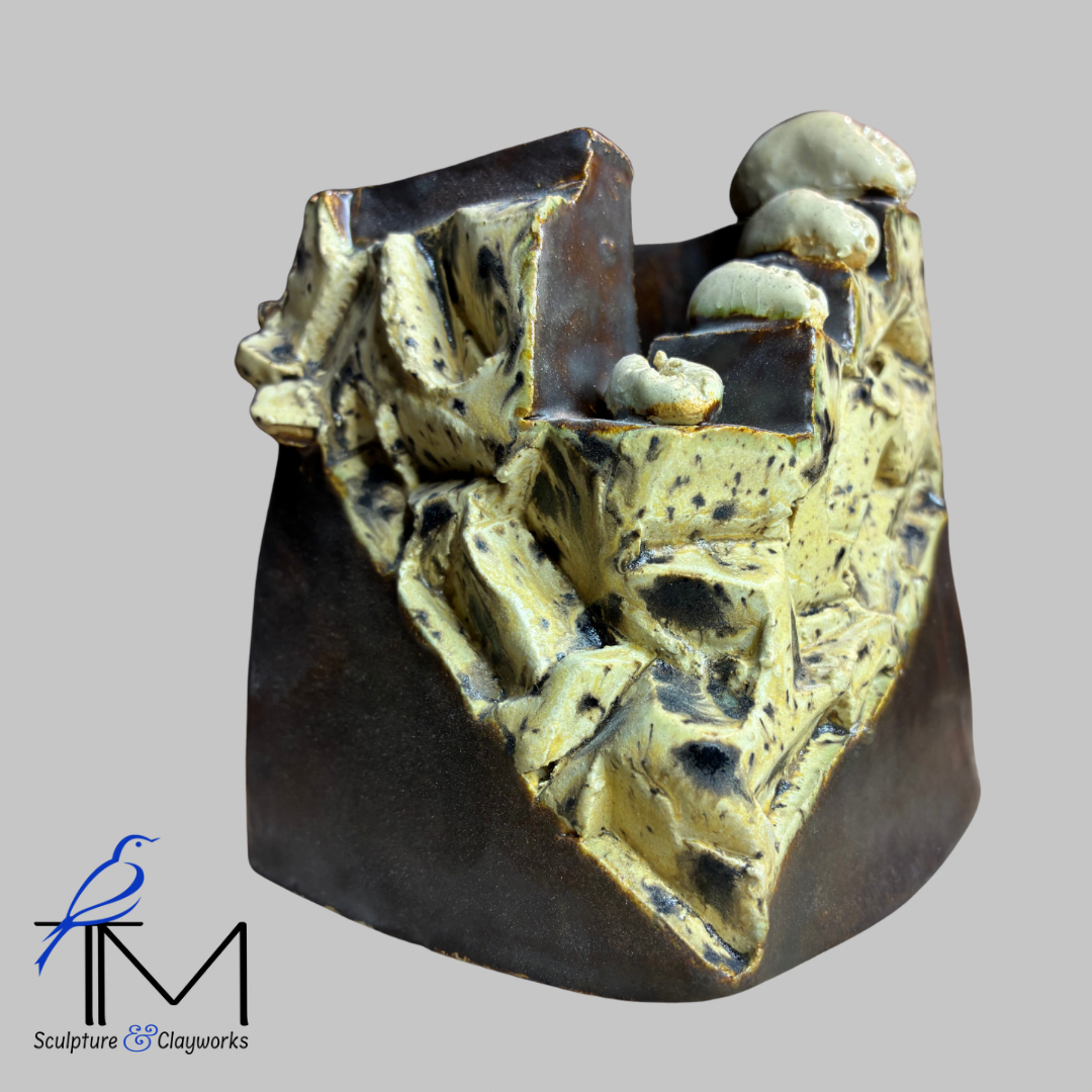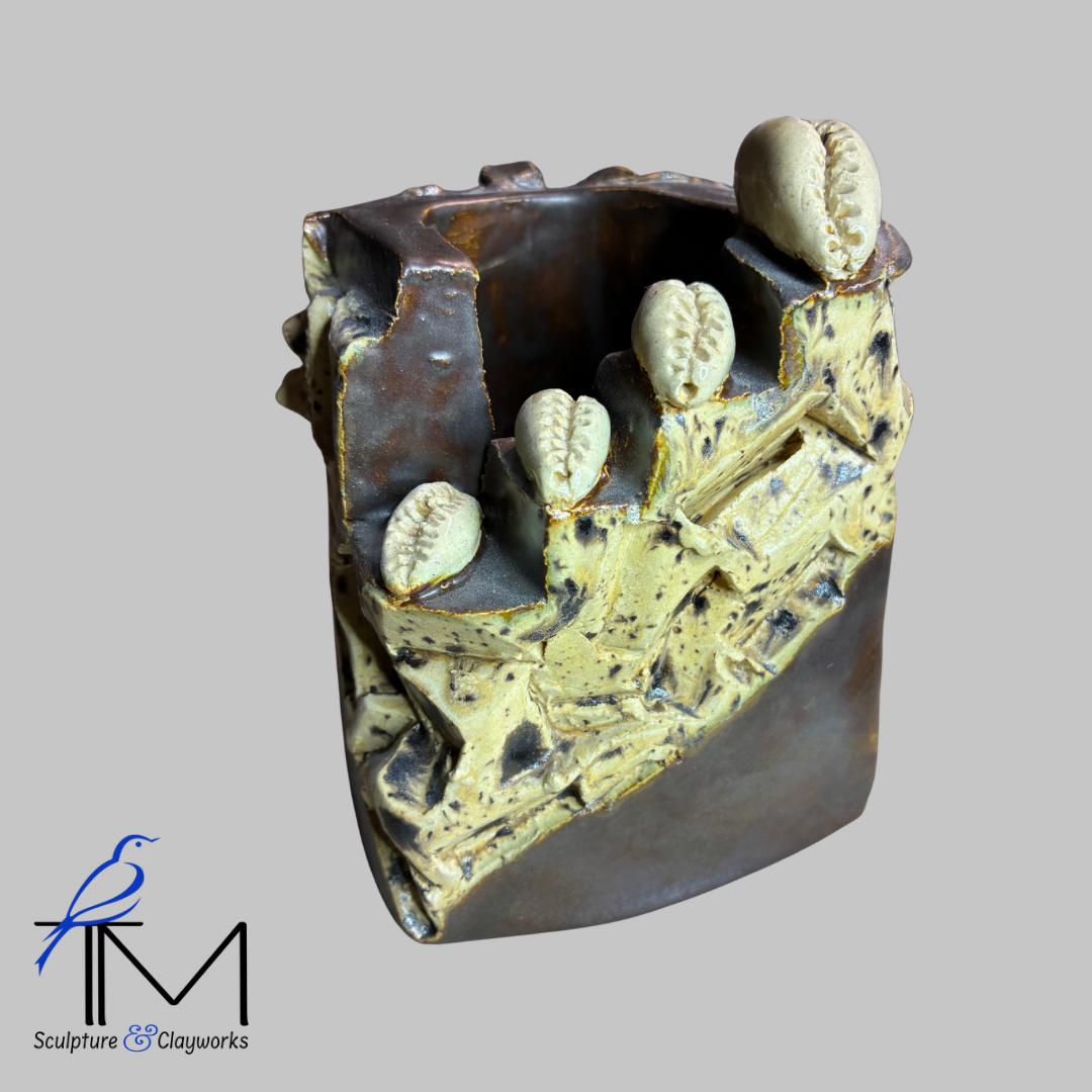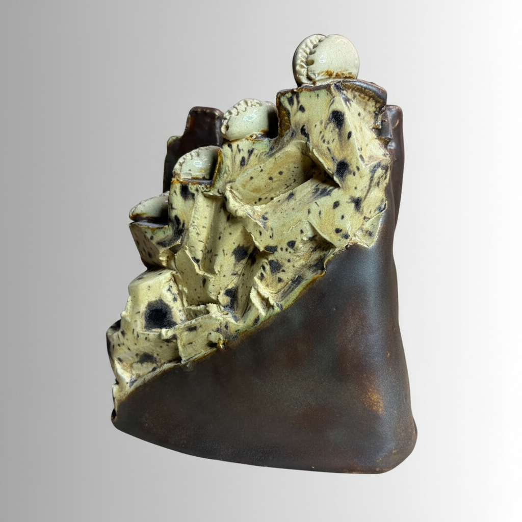 Hand built stoneware sculpture featuring hand rolled cowrie shells atop staircase architecture