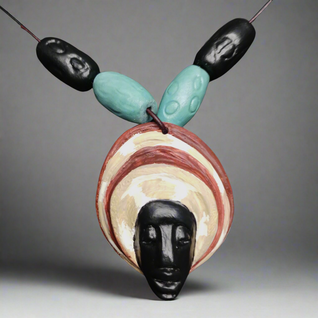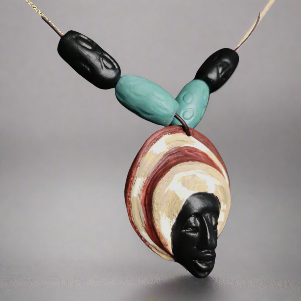 Gele Goddess Necklace, acrylic painted in Black complexion, with brick red, vanilla cream and khaki gele designs, complemented by distressed green and black hand rolled beads on leather cord with spring clasp.
