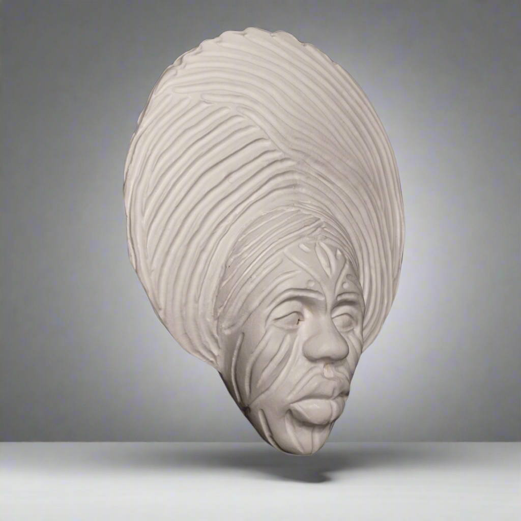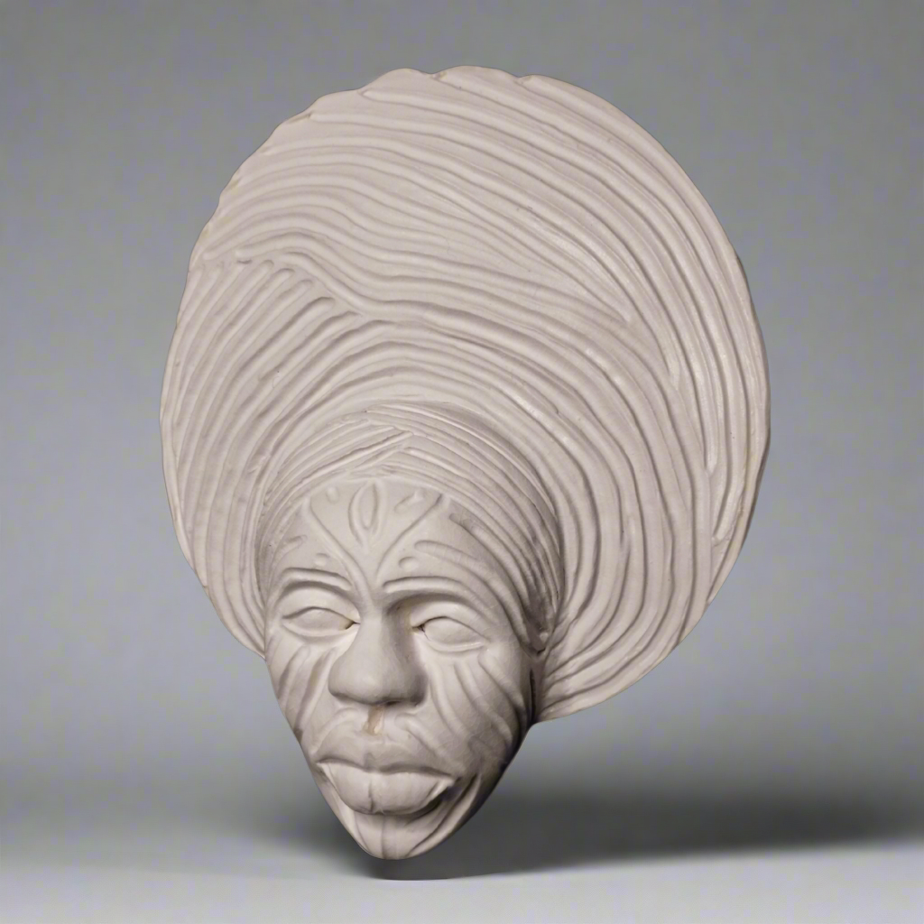 Gele Goddess series - Ivory glazed stoneware wall plaque (with hanging tunnel for nail or hook) depicting scarification and a heavily pleated gele in a maze-like design.