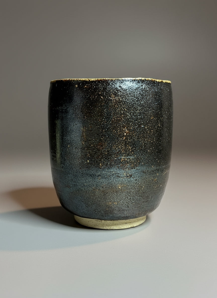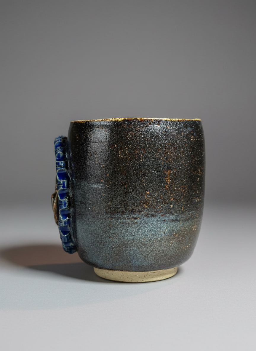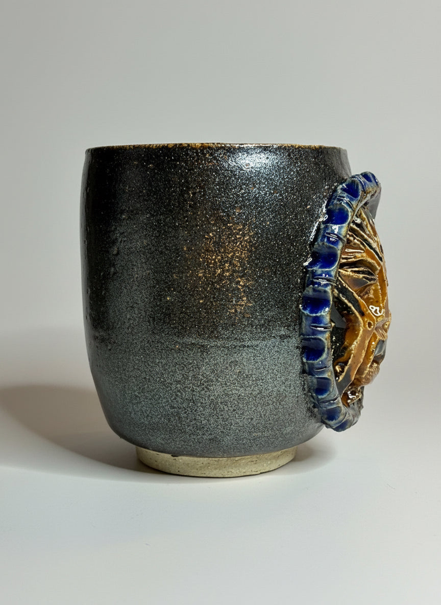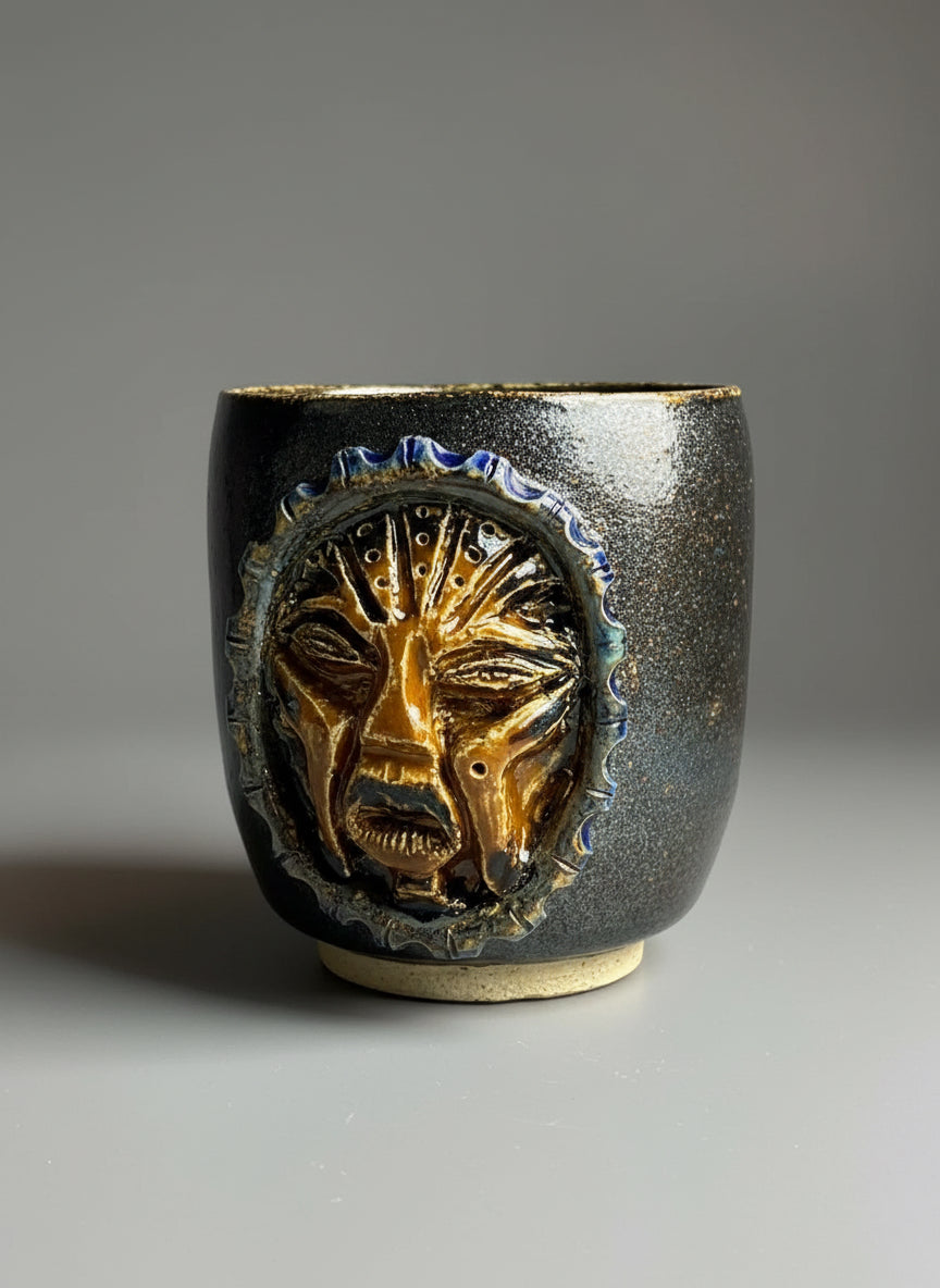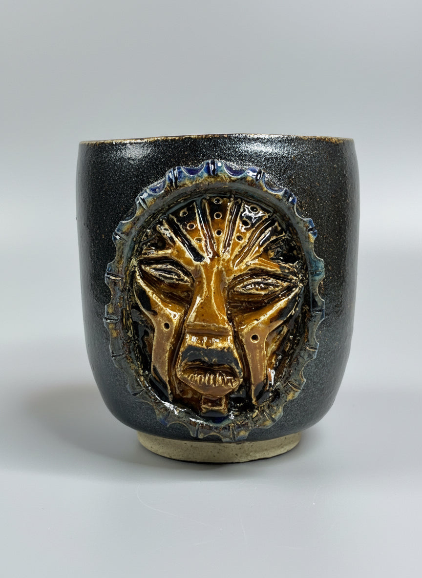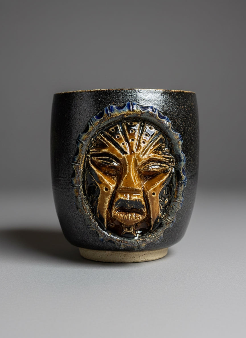 Twice fired stoneware glazed cup featuring African mask against carved cameo platform.