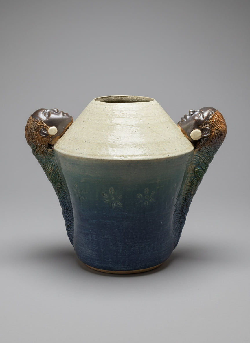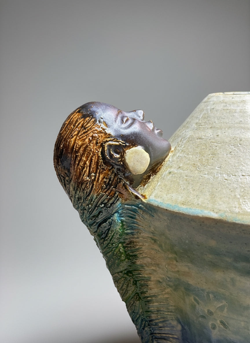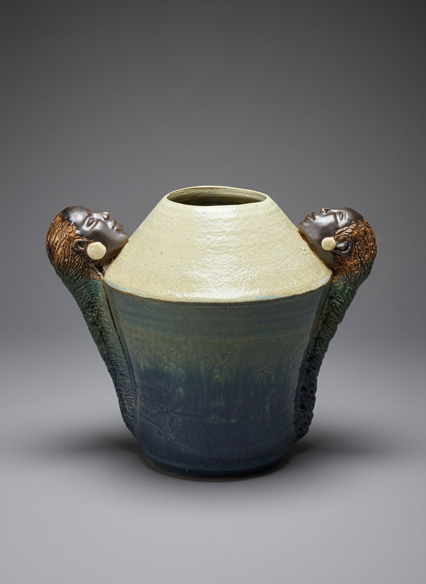 This powerful twice fired stoneware Vessel with Hand sculpted inclusion of two African women with long braids considers how many sisters cousins and tribe members made the impossible choice to free themselves together.