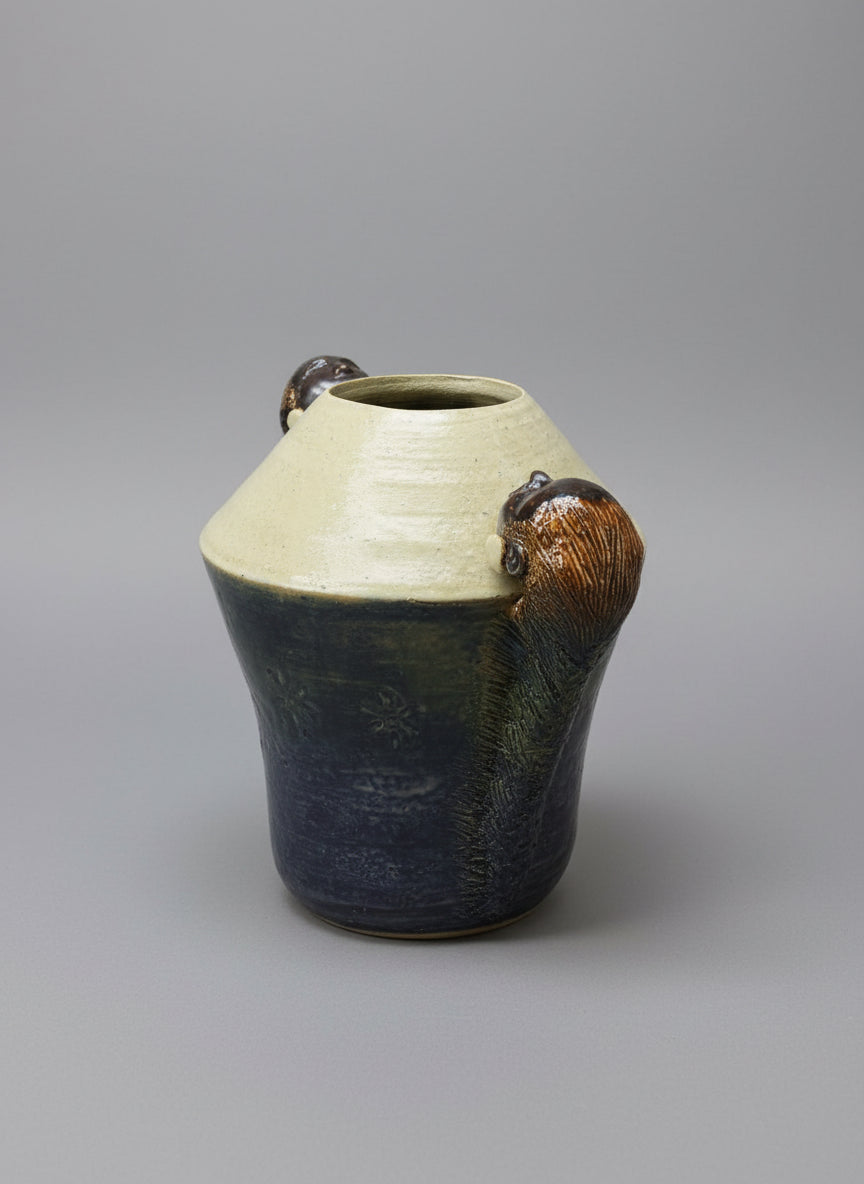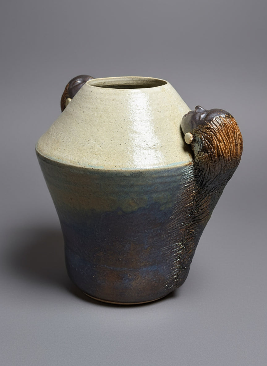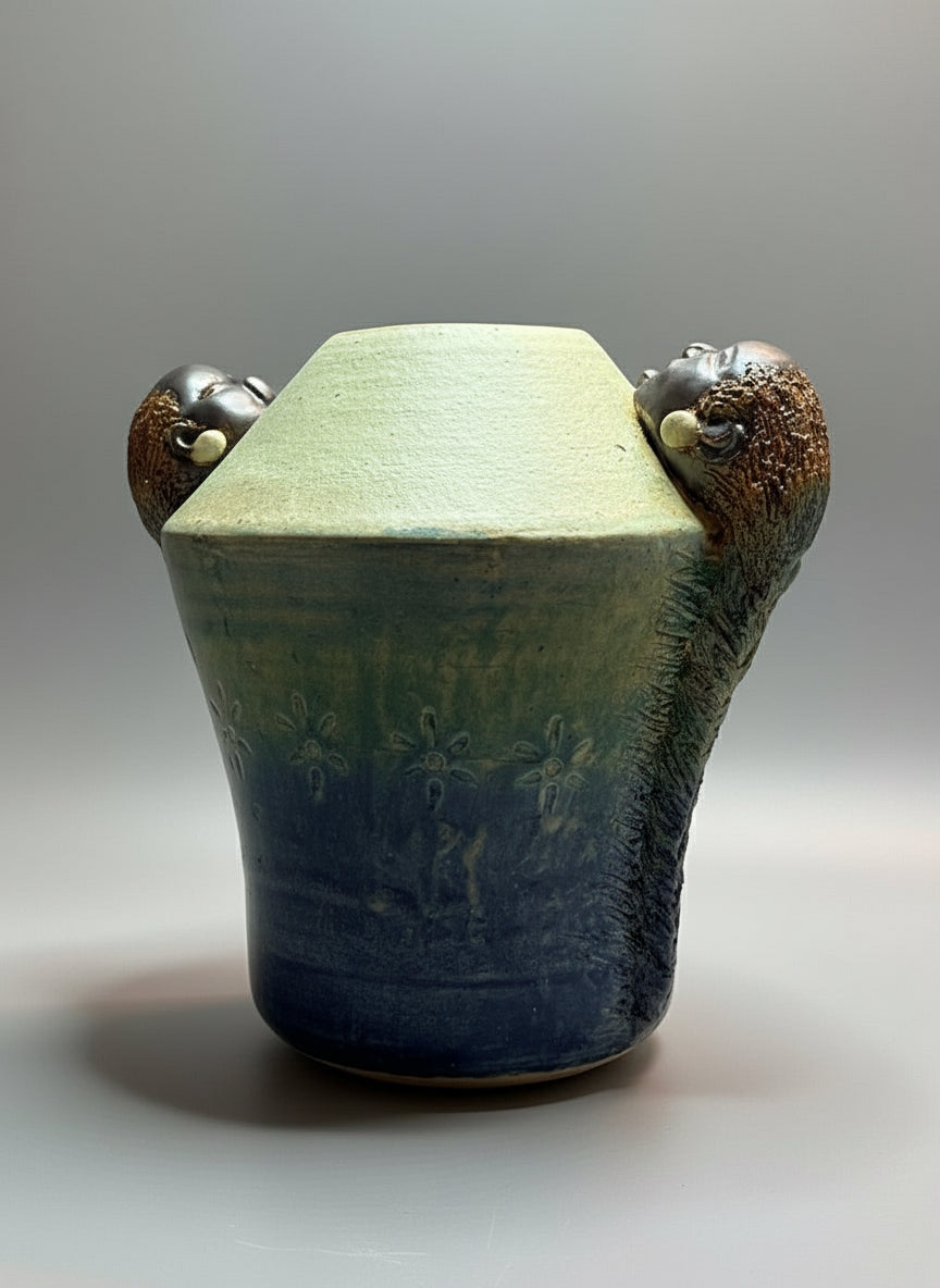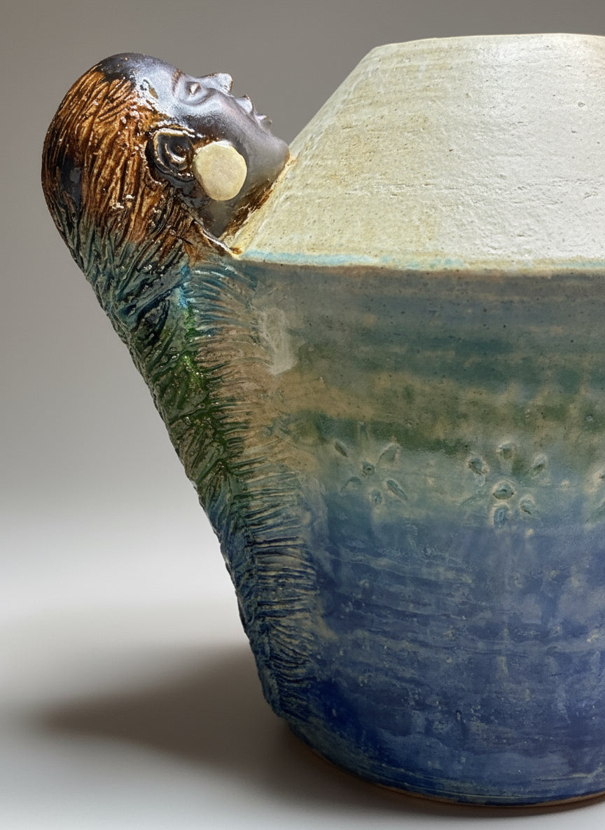 This powerful twice fired stoneware Vessel with Hand sculpted inclusion of two African women with long braids considers how many sisters cousins and tribe members made the impossible choice to free themselves together.