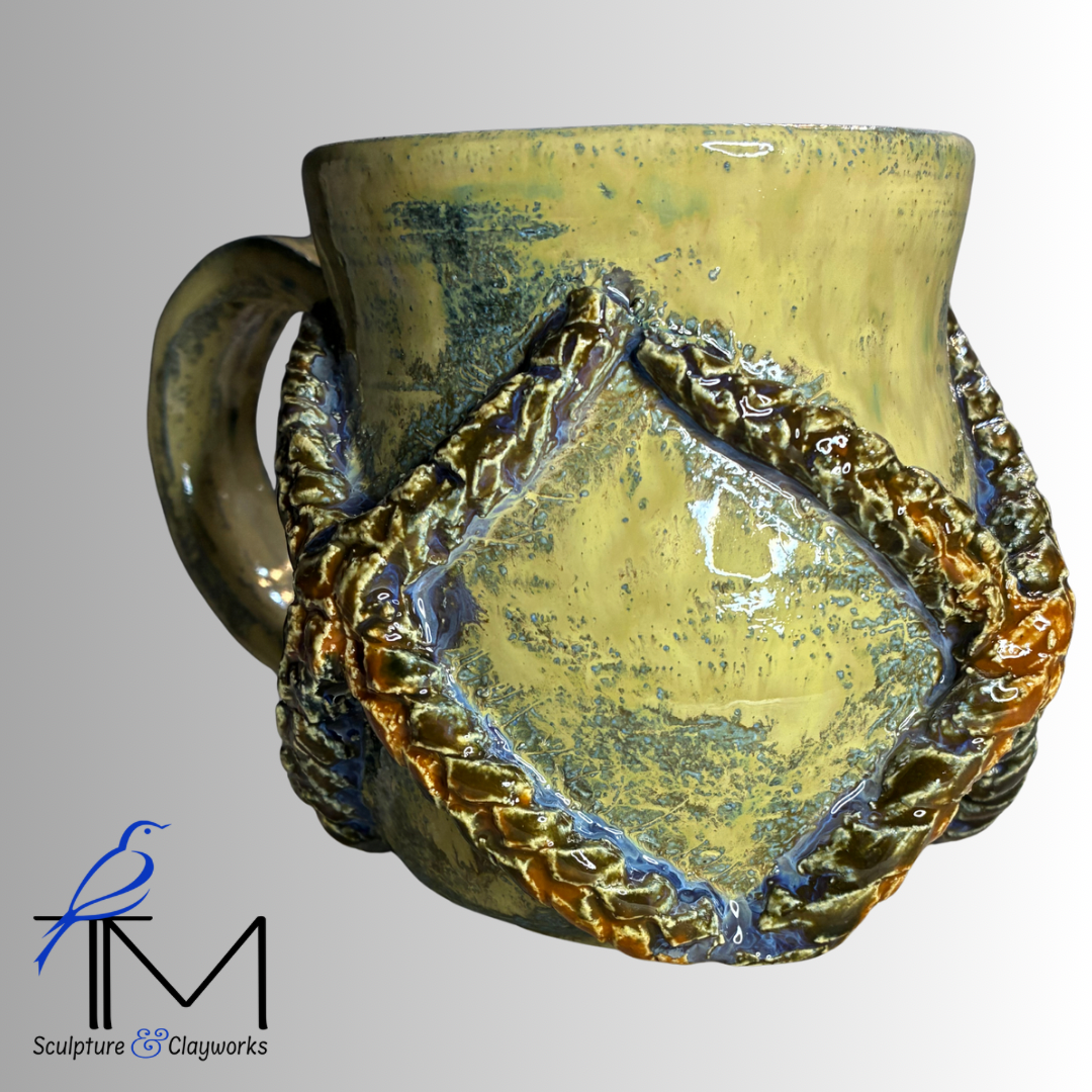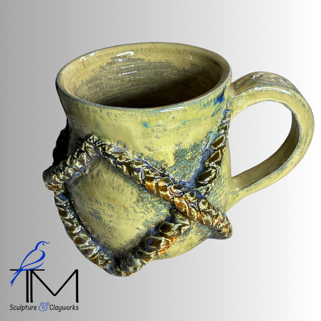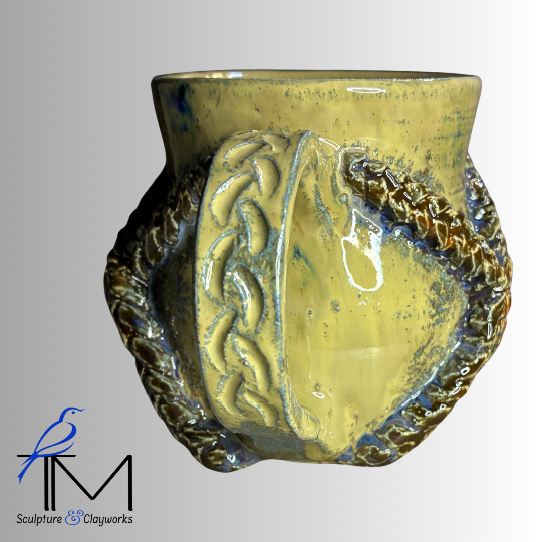 Stunning twice fired stoneware cup with exquisitely weathered appearance featuring criss crossed cornrow designs. Glazed with the colors of blue yonder, stormy blue swirl applications, and milk chocolate.