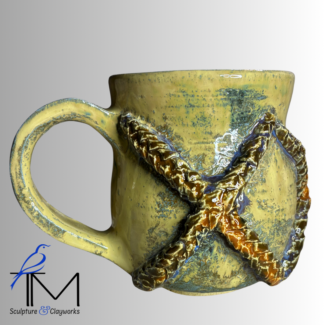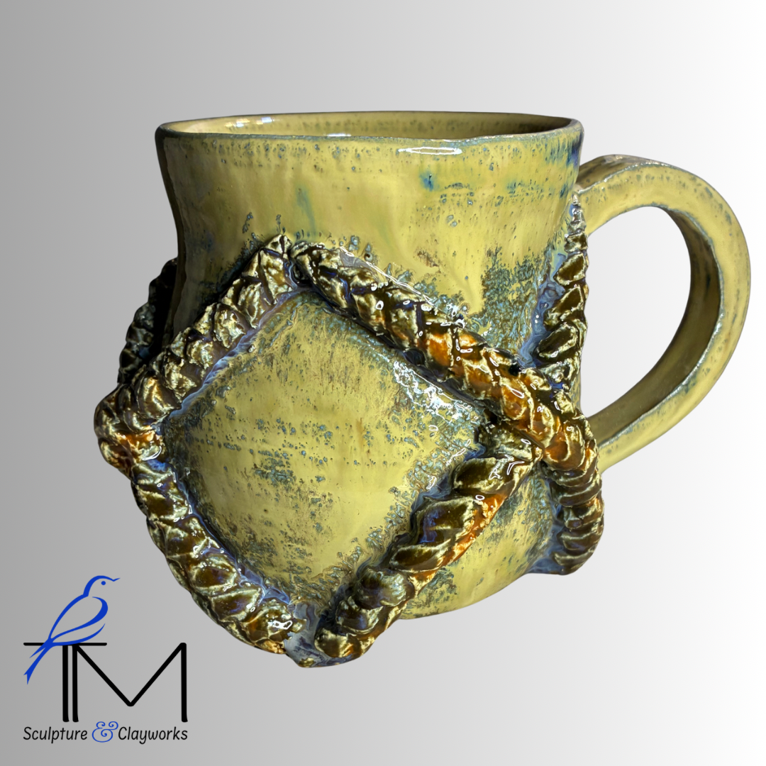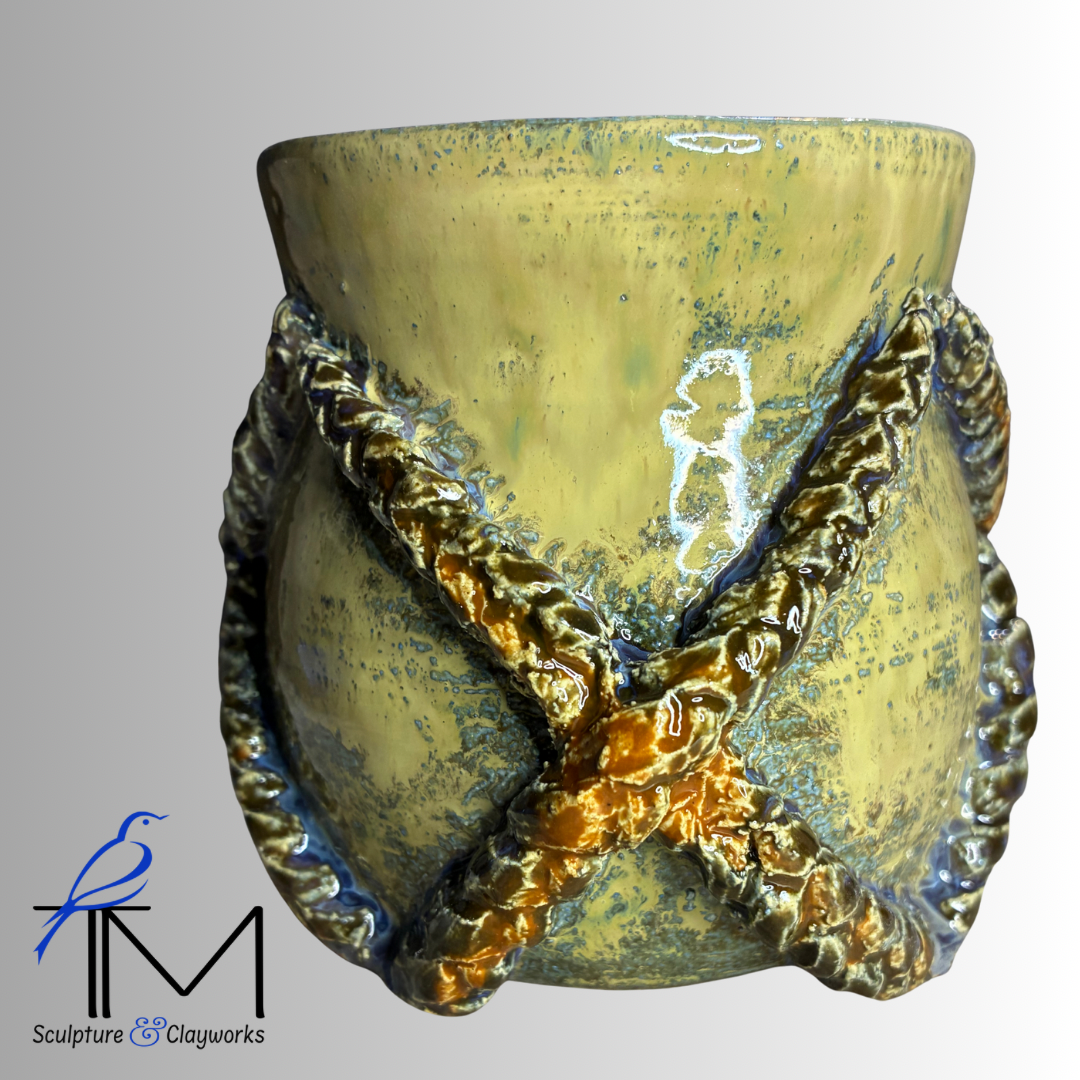 Stunning twice fired stoneware cup with exquisitely weathered appearance featuring criss crossed cornrow designs. Glazed with the colors of blue yonder, stormy blue swirl applications, and milk chocolate.