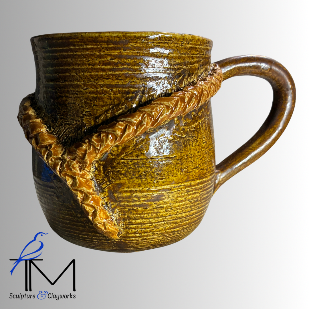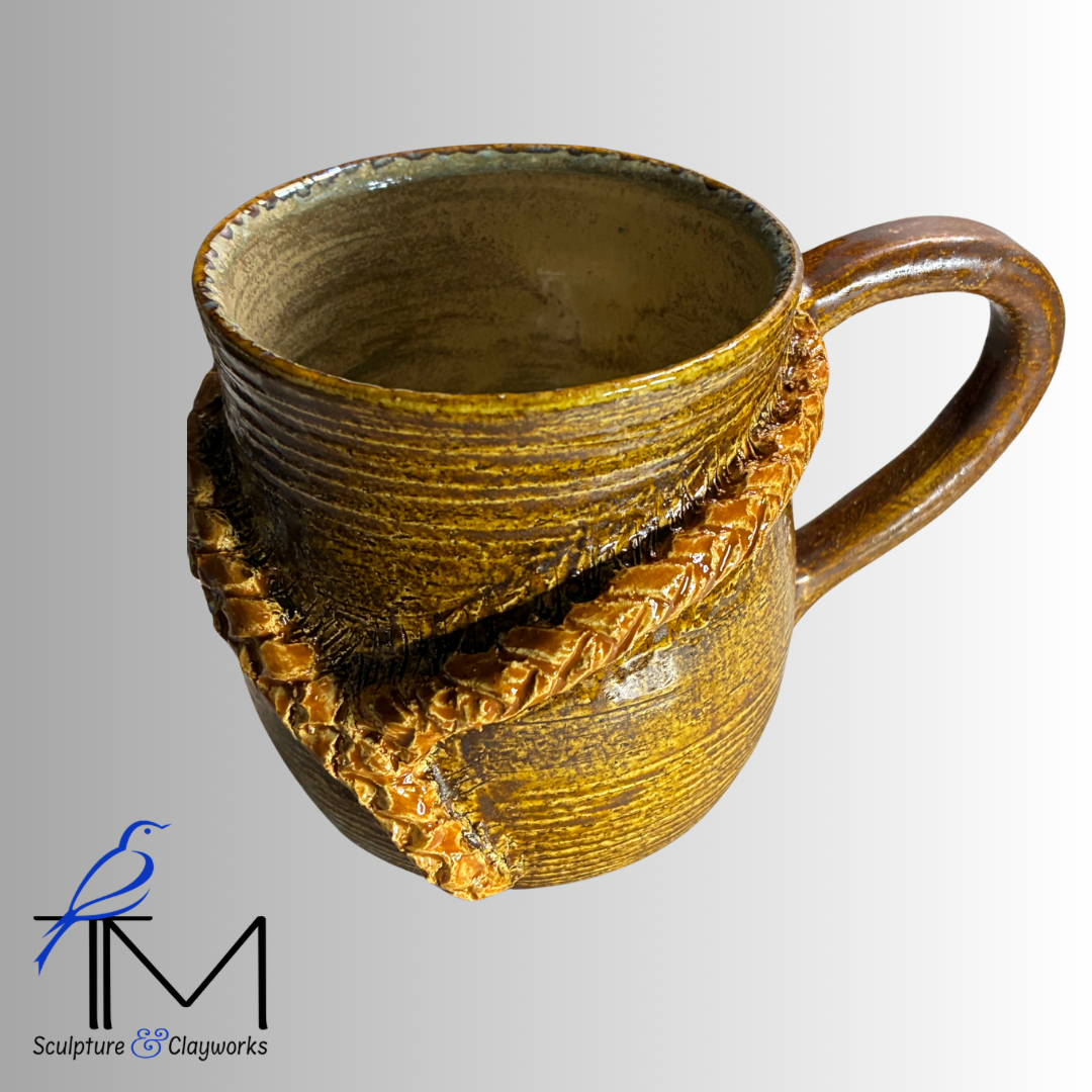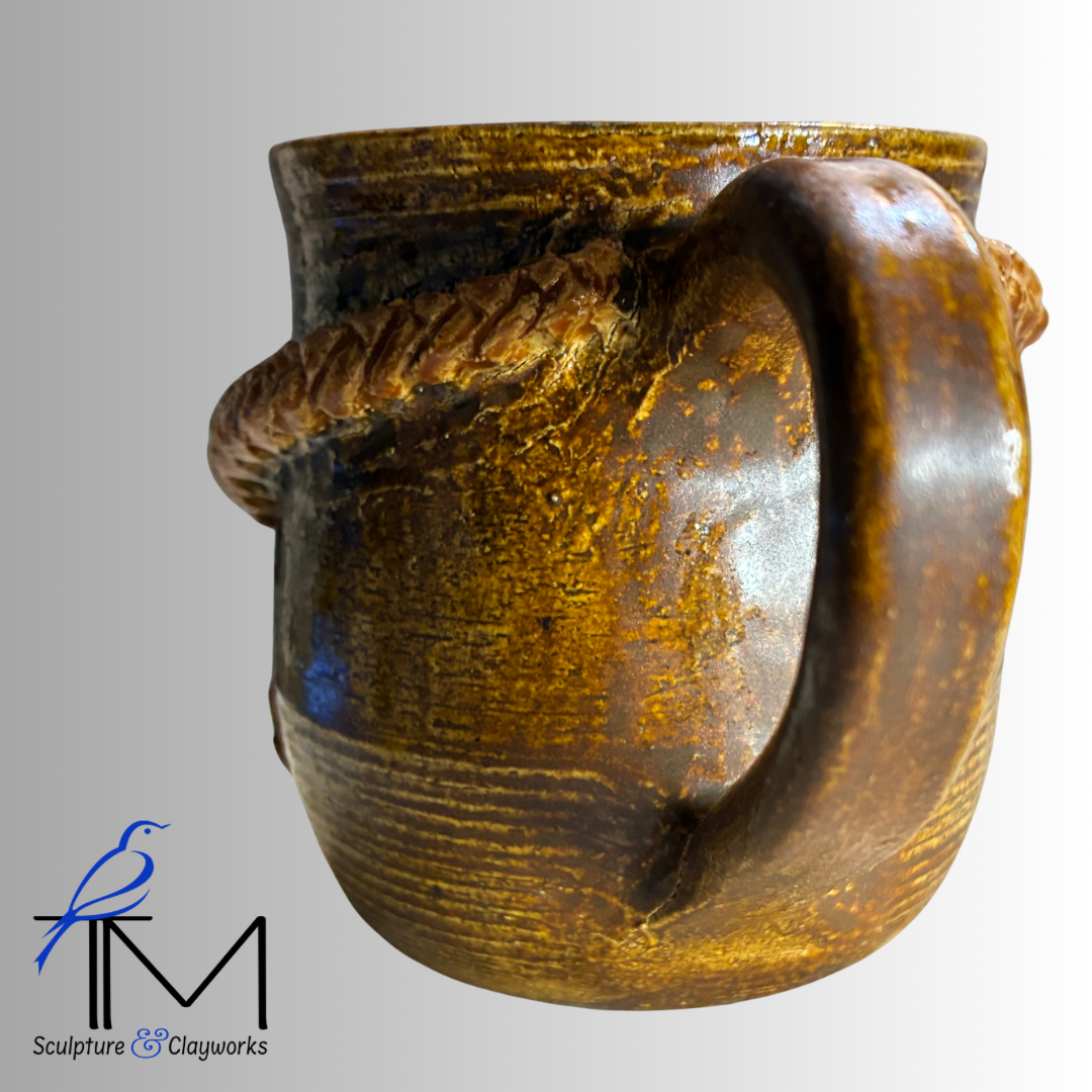 Twice-fired stoneware cup featuring beautiful sculpted braids that intersect into a Y-design.