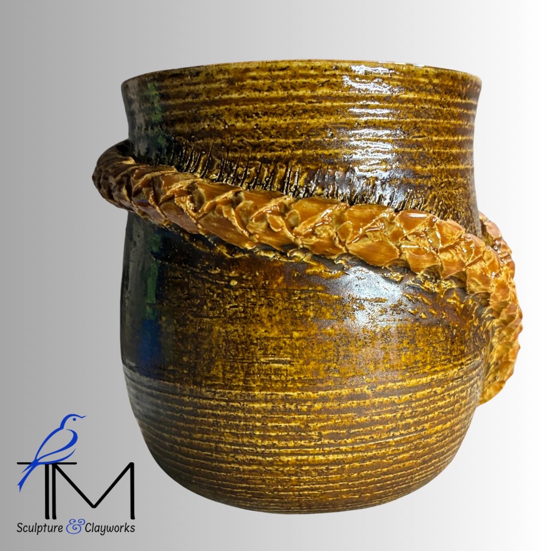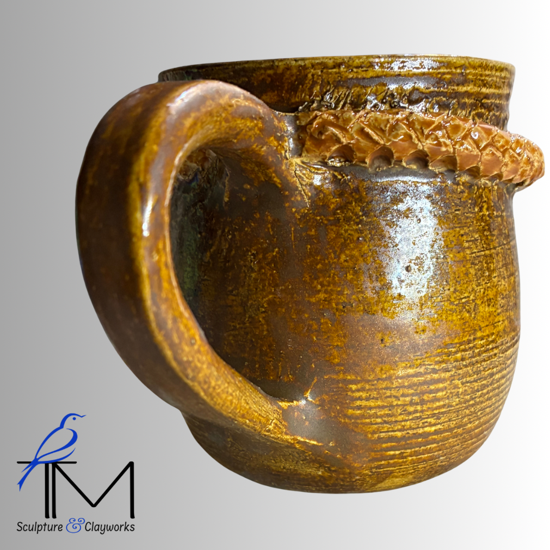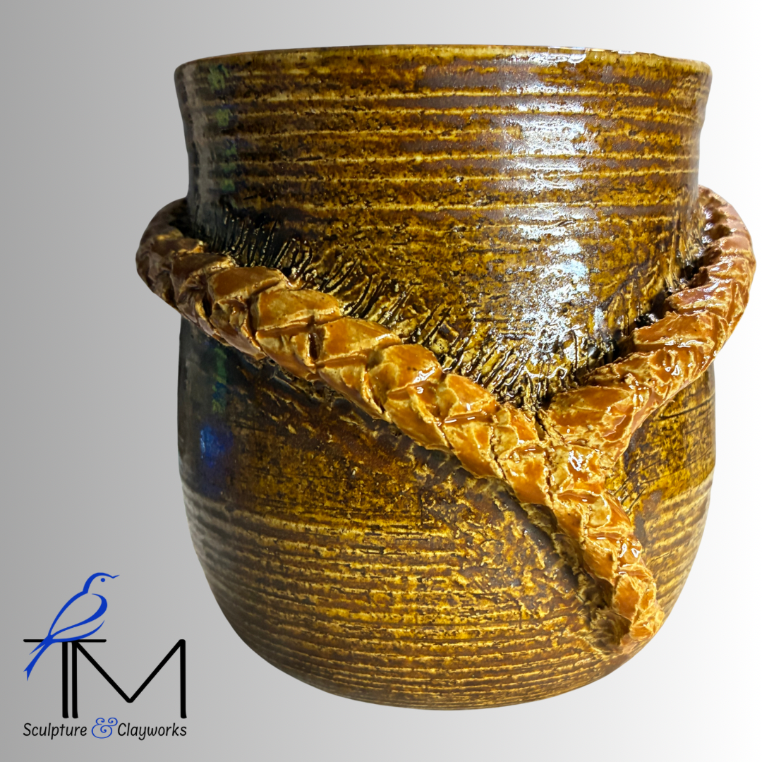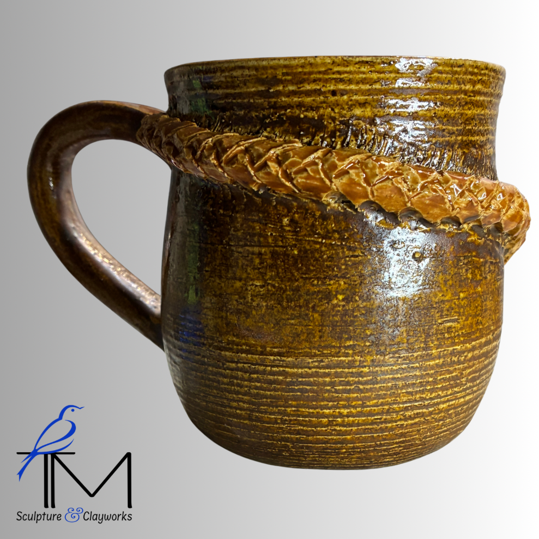 Twice-fired stoneware cup featuring beautiful sculpted braids that intersect into a Y-design.