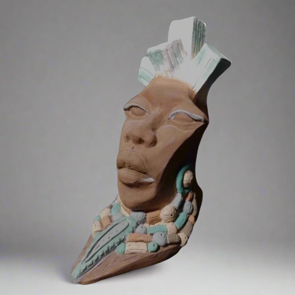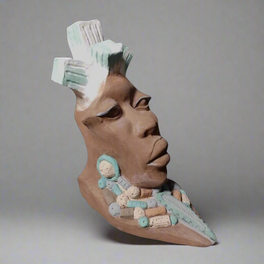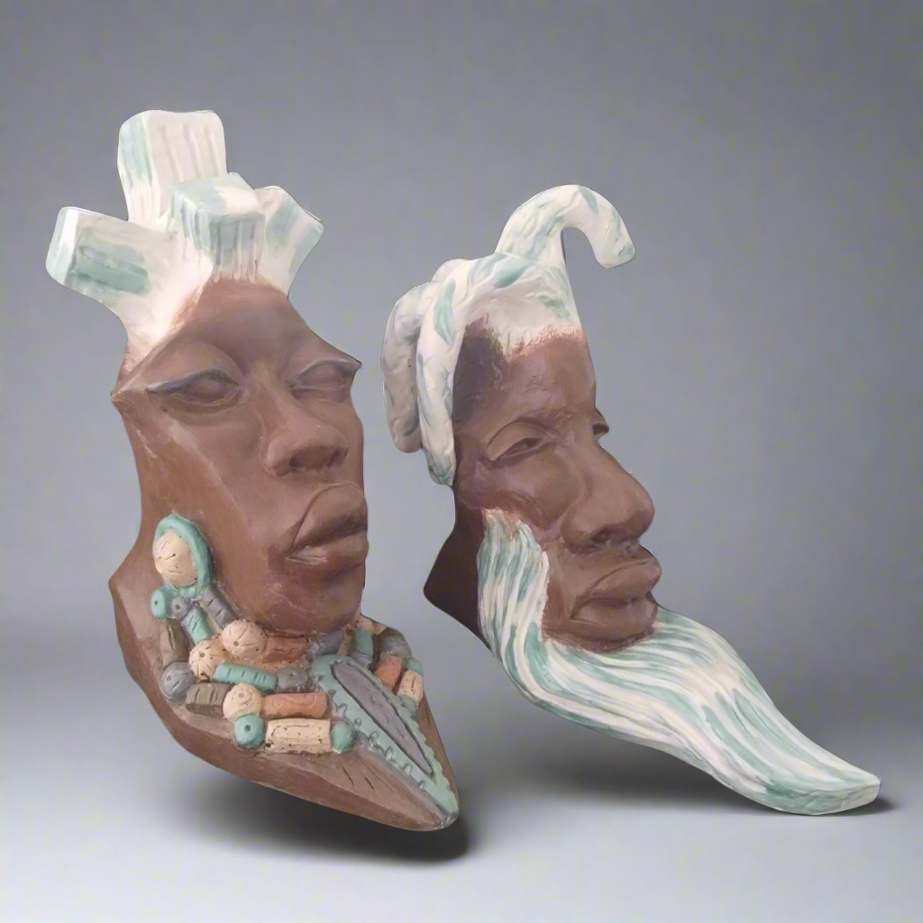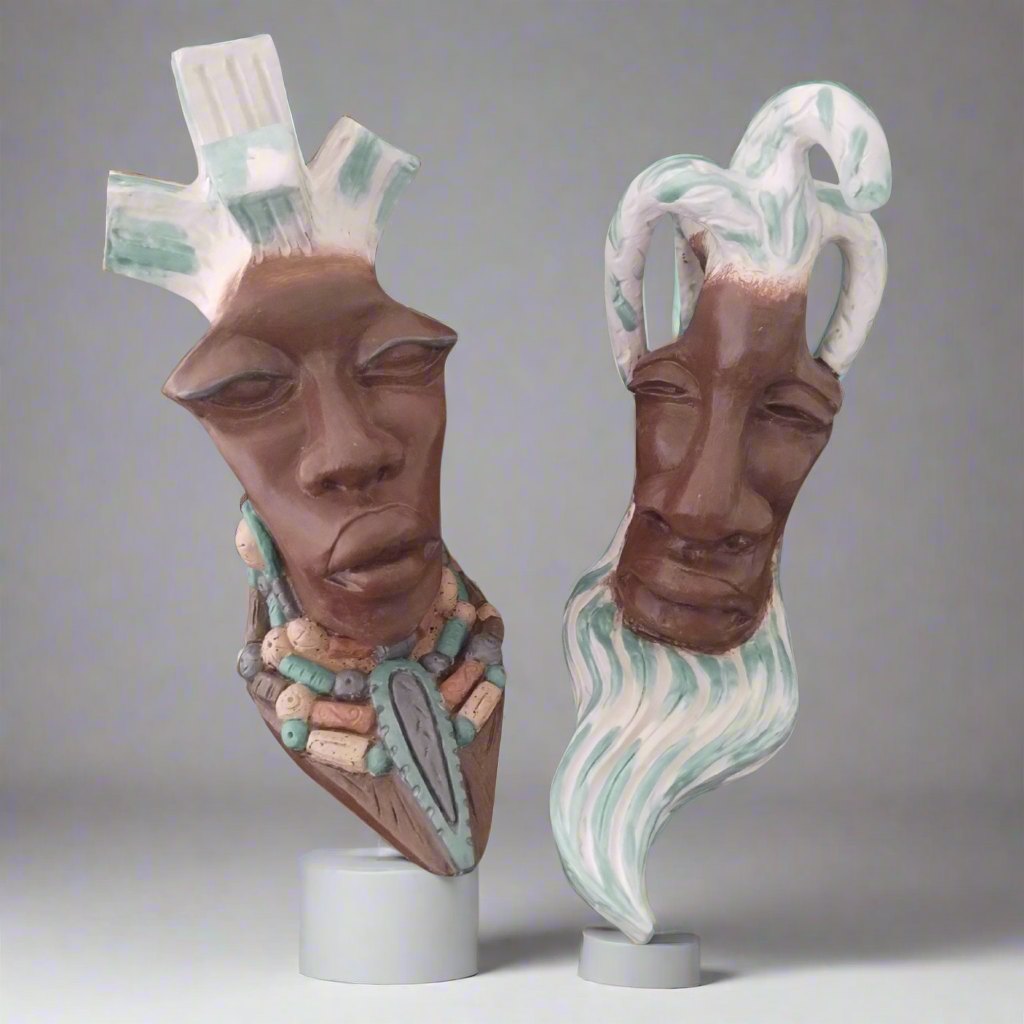 Archeological style freestyled mid-size sculpture of Ancestral woman, matte glazed in chocolate brown tone with mint green accented white structural wick locs, jeweled extended neckplate colored in matte tones of lavender, mint green and peach. Ancestral Man counterpart with "weeping willow" wic locs with level extended white beard accented with mint. . Finished with a gloss gel medium.