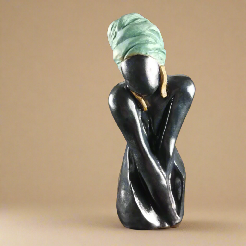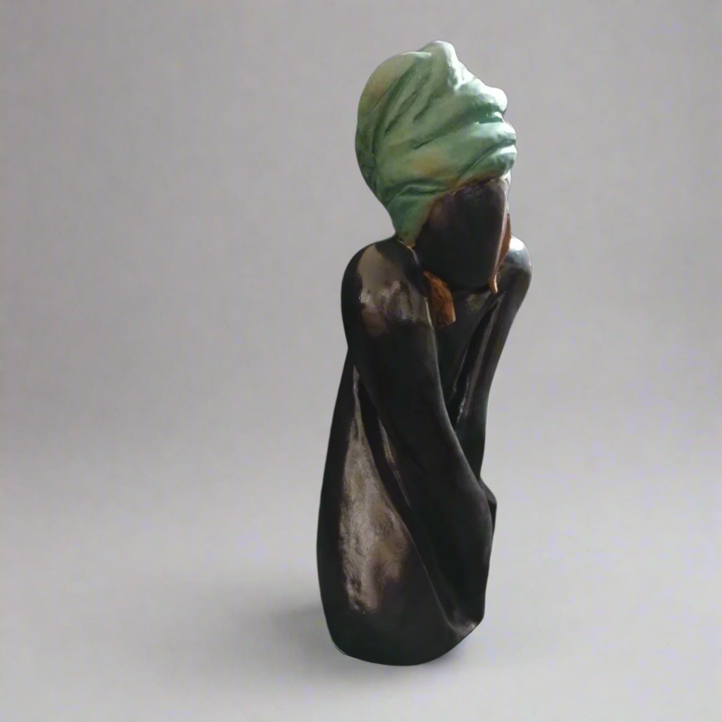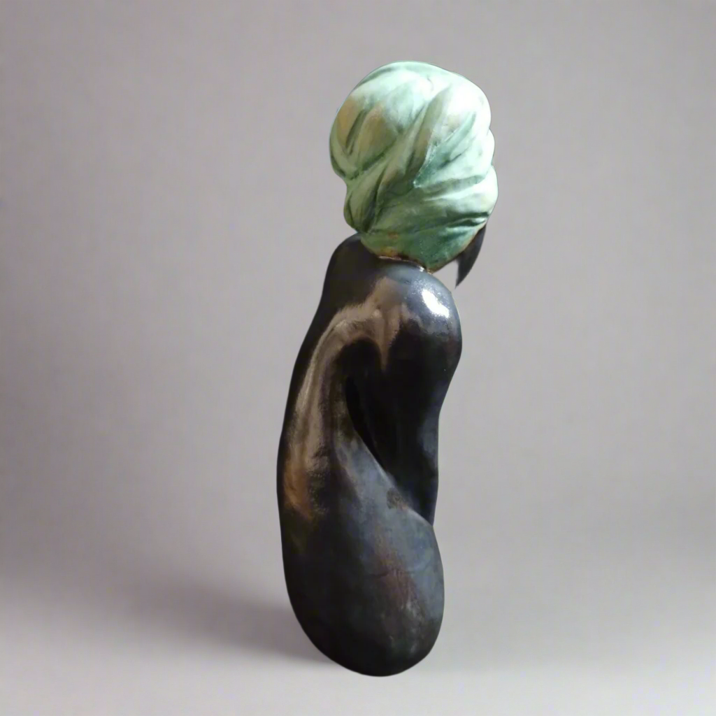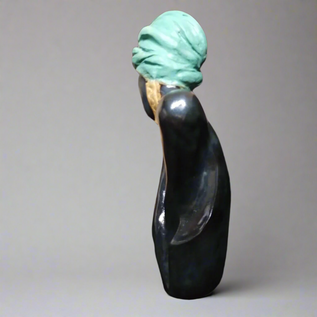 Intriguing stylized bisque and glaze fired stoneware sculpture of a very demurely positioned woman adorned with a Satin Patina head scarf.