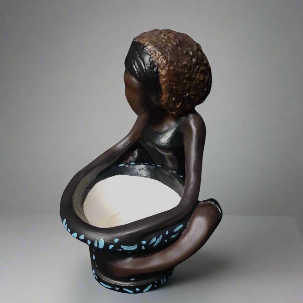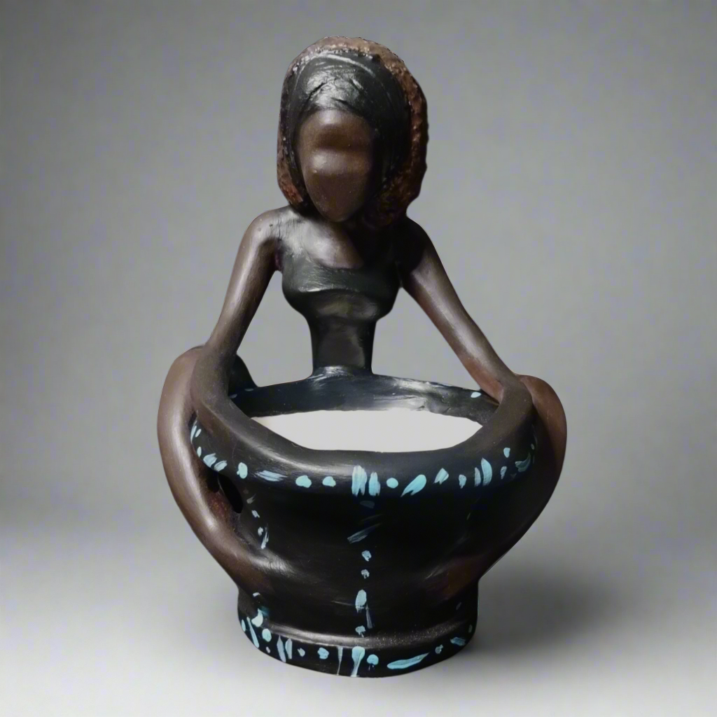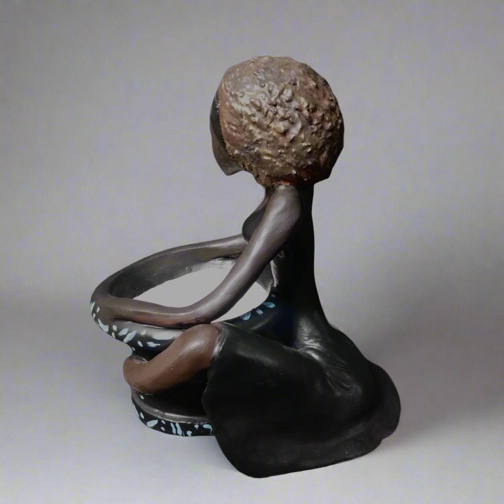 From the Vessel Goddess series: Mid-sized stoneware clay sculpture created to inspired reflection on the things we carry with us and protect. acrylic painted in brown and black highlighted with blue accents.
